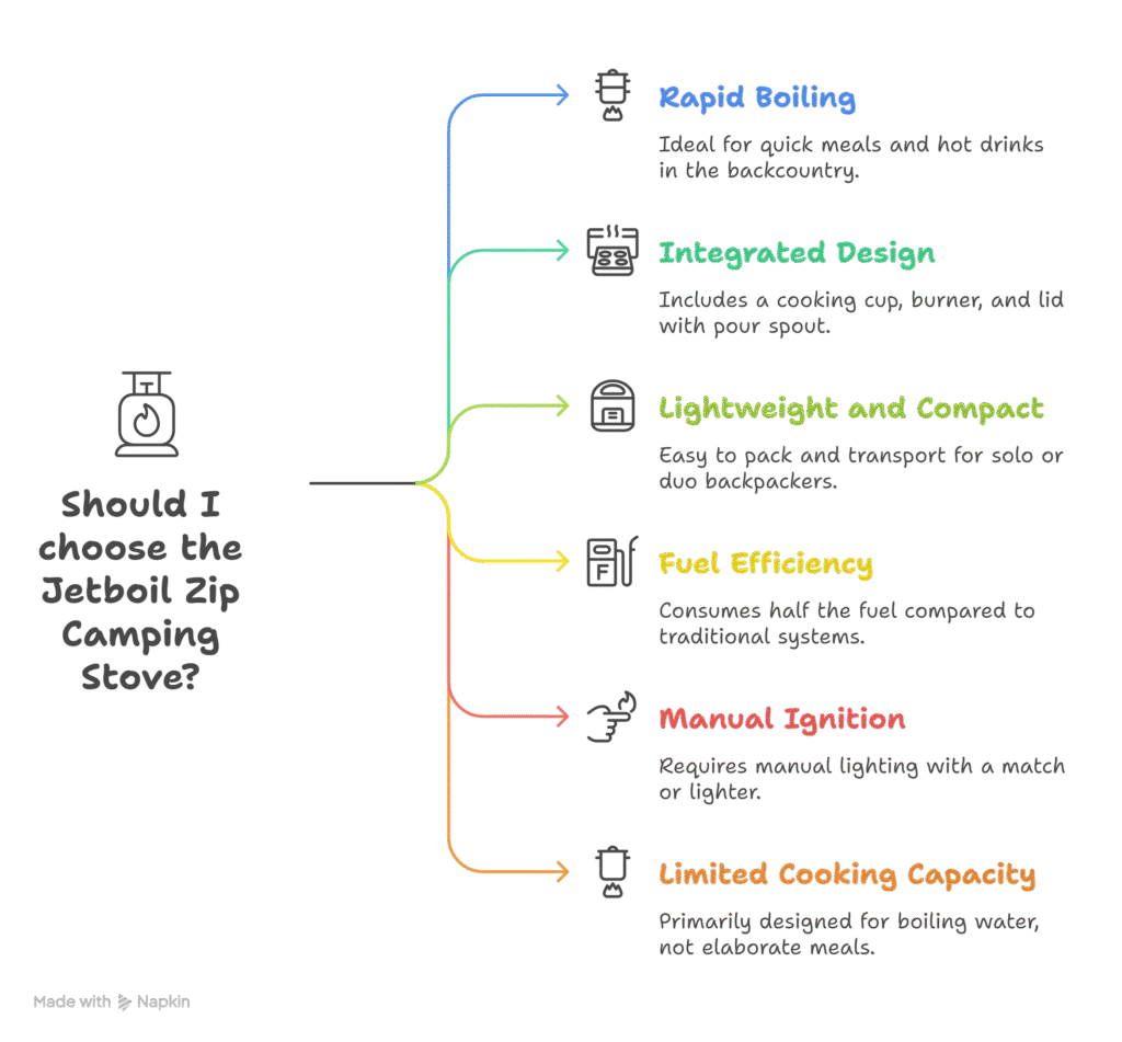 • Rapid Boiling: Jetboil’s FluxRing technology allows the Zip to boil 0.5 liters of water in about 2 minutes. This makes it perfect for quick meals or hot drinks in the backcountry.